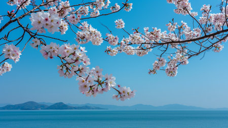 Horizontal shot of Sakura blossoms in bloom over a backdrop of sea