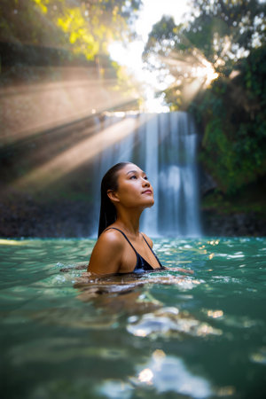 Serenity in Nature With a Woman Enjoying a Tranquil Moment Near a Waterfall at Sunset