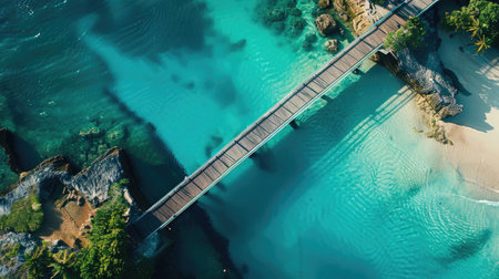 An aerial view of a tropical island showcasing a dock extending into the aqua water leading to a beautiful beach surrounded by lush green trees and natural landscape AIG50