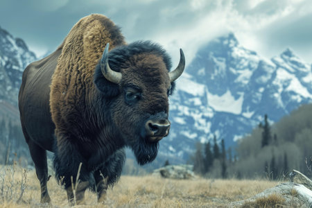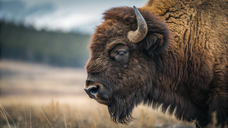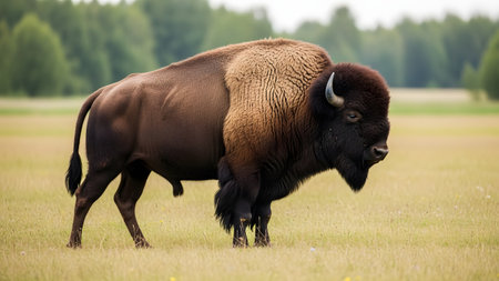 A large bison is the focal point of this image, standing in a field. The scene captures a natural environment with trees in the background, under overcast lighting. The composition is suitable for various commercial uses, including illustrations and editorial content, and it evokes a sense of wildlife.