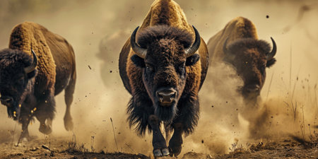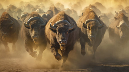A powerful American bison charges through a dusty prairie, showcasing its strength and majesty. The golden hour light enhances the wild beauty of this iconic animal in its natural habitat.