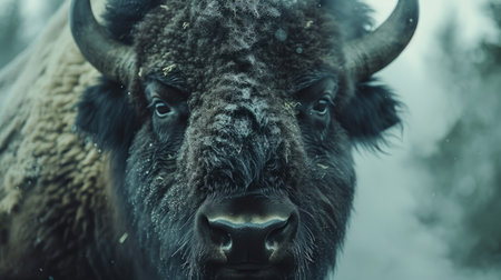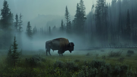 Majestic bison emerges from ethereal mist in nature.