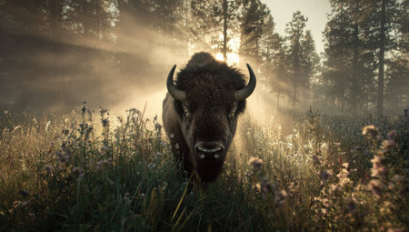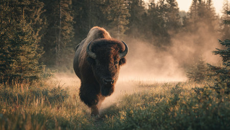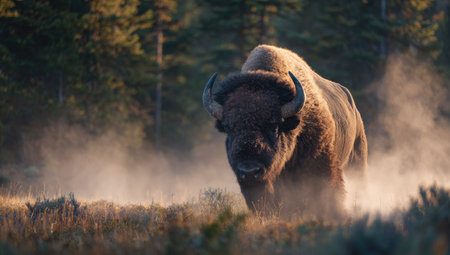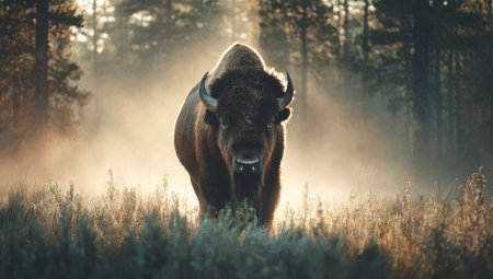 A large bison stands prominently in a field, bathed in warm sunlight filtering through the trees. The image showcases the animal's dark fur against the backdrop of a misty forest and tall grasses. This scene evokes a sense of wildness and natural beauty, suitable for various editorial and commercial applications.