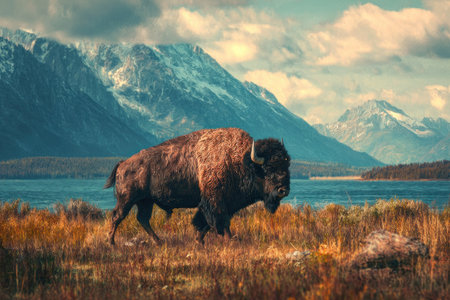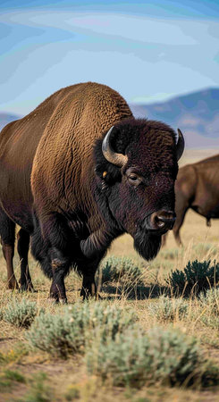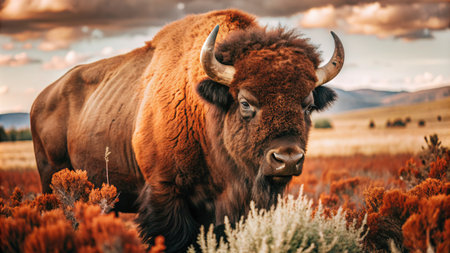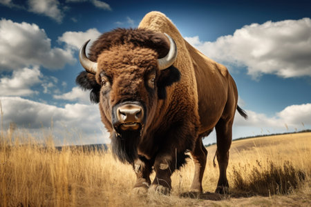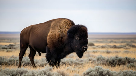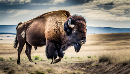 A large bison stands prominently in a field under a partly cloudy sky. The animal's brown fur contrasts with the tan grasses and the muted tones of the environment. The image uses natural lighting and a wide angle to showcase the subject, suitable for various editorial and commercial applications.