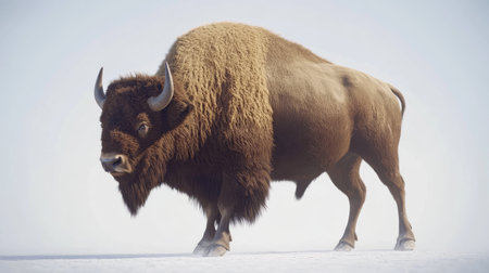 A large bison, featuring a dark brown coat and prominent horns, is captured in a wide shot against a soft, bright background. The animal is positioned centrally, emphasizing its size and strength. The composition uses natural light to create a sense of openness and vastness, suitable for a range of commercial applications.