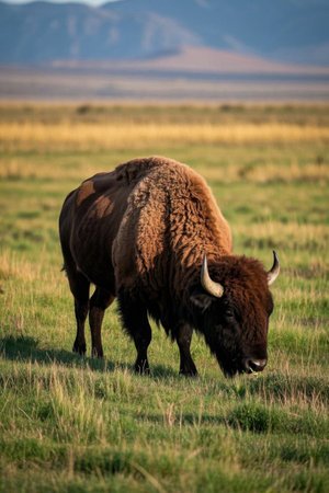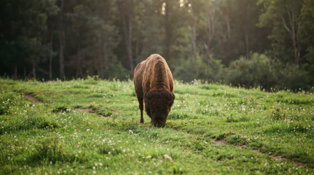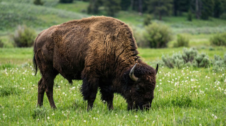 A large wild buffalo stands in a vibrant green field, eating grass and wildflowers. This iconic mammal represents the American wilderness and conservation efforts in national parks.