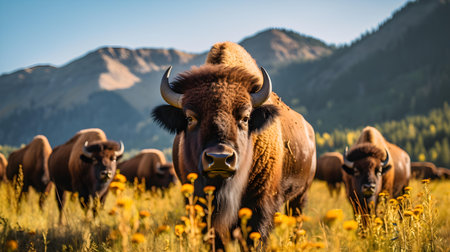 Bison Herd Grazing in Mountain Meadow