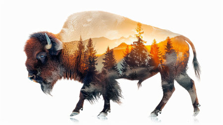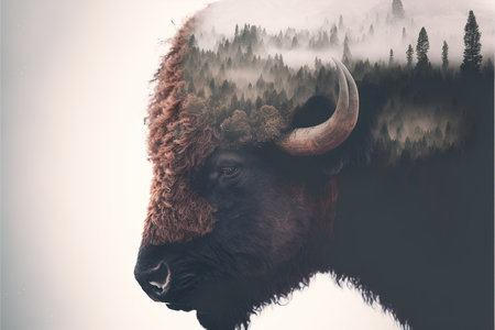 American male bison grazing on grassland with double exposure background of natural scenery in yellowstone. Large mammal body with fur and horn. Superb Generative AI.