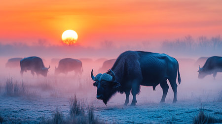 Buffalo in the morning fog at sunrise