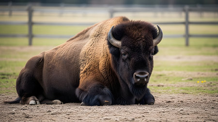 A large American Bison rests on the dirt ground in an enclosure with a wooden fence in the background. The close-up captures the texture of its thick fur and massive head while at rest.