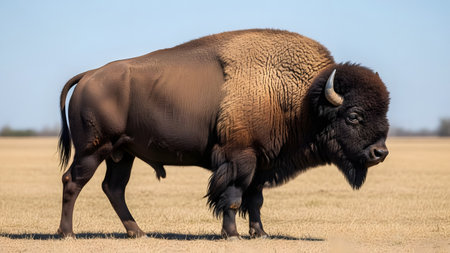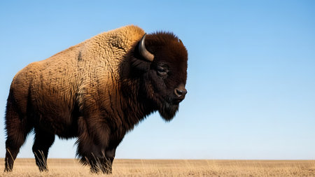 A majestic American bison stands in profile amidst dry prairie grass under a clear blue sky. The image captures the thick, textured fur and powerful build of the animal in its natural habitat.