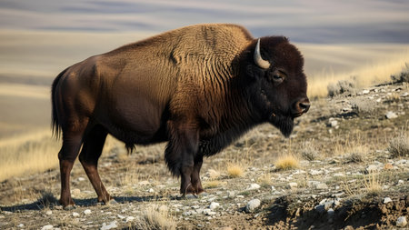 bison standing on a hillside in an open range, created with generative ai