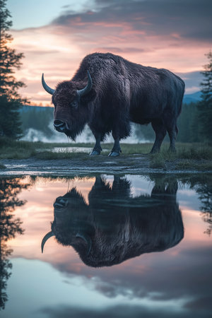 A large bison stands gracefully near a calm body of water, mirroring the vibrant colors of a sunset sky and surrounding nature scene perfect for wildlife and landscape enthusiasts.