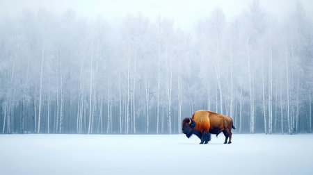This stunning image captures a majestic buffalo walking gracefully through a snowy landscape, emphasizing its powerful presence in the serene winter wilderness.