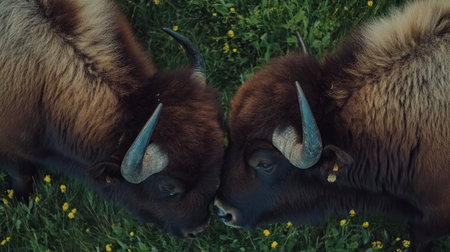 Two bison face each other in a natural setting, surrounded by green grass and yellow flowers. This intimate moment captures the essence of wildlife and nature.