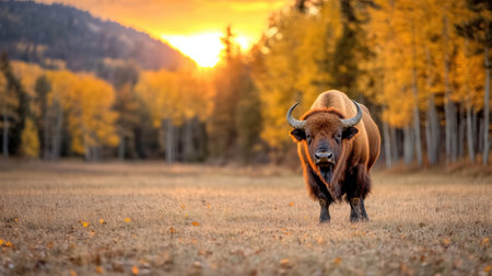A buffalo stands in golden field with autumn foliage and sunset