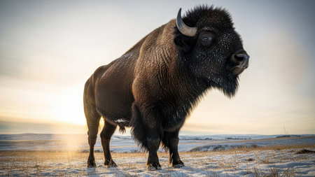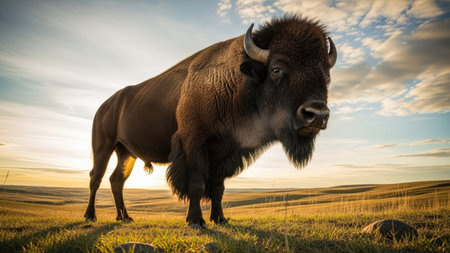 a bison stands majestically in the sunset, depicted in a graphic design-inspired illustration style. this 32k uhd image captures the essence of nature's beauty, with influences from artists such as cliff chiang and butcher billy. the impressive panorama and minimalist background add to the overall aesthetic, reminiscent of the works of eastman johnson. ai generated