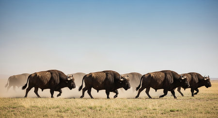 Buffalo herd running in the savanna of Amboseli National Park, Kenya
