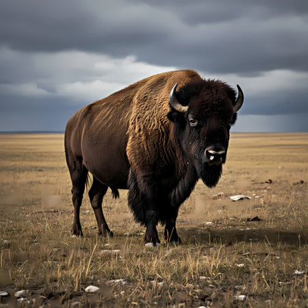 Powerful american bison is standing on the plains with a dramatic sky in the background