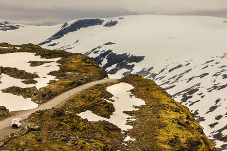 Great asphalt Snow Road. Cold July in Northern Europe.Huge cold snowfields and sharp stone placers. Low gray clouds and fog. Journey to the fabulous northern country of Norway.