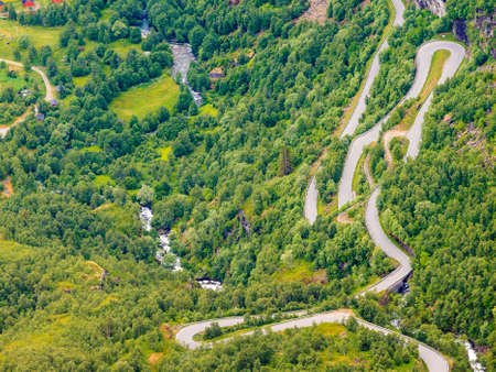 Serpentine curved road in the rocks from Dalsnibba mountain to Geiranger fjord. Norway.
