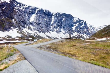 Road running through norwegian mountains and parked camper car. Beautiful landscape. Travel and tourism.