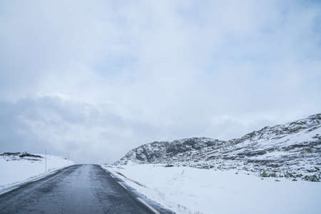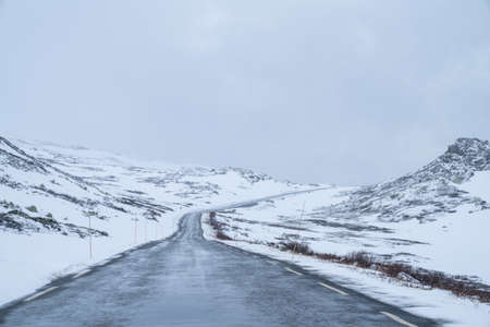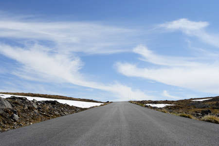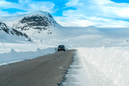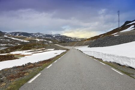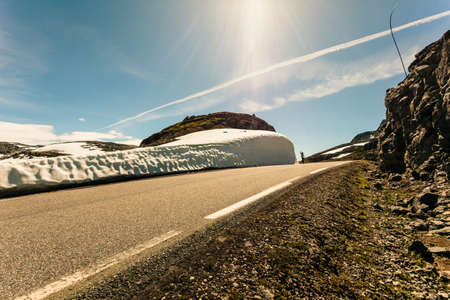 Snow banks and dry road in Norway. Haukelifjellet in Telemark region. Norwegian summer.