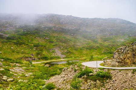 Road through stone rocky mountains, misty foggy day. Norway summer landscape. Norwegian national tourist scenic route Ryfylke.