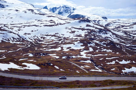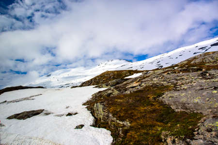 Snowfield and mountain road Aurlandsvegen between Aurland and Laerdal in Norway, summer time