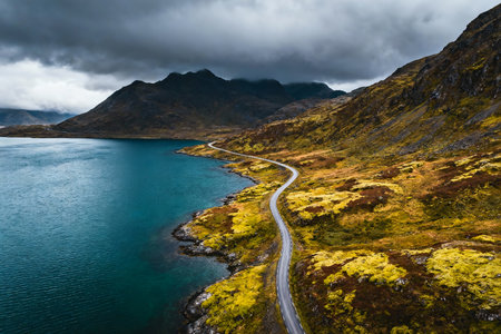 Road to scandinavian mountains at breathtaking national park on gloomy autumn day.