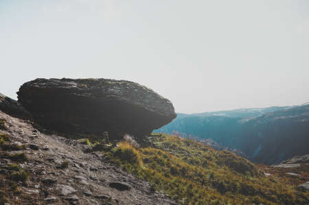 Big ancient stone on the cliff with scenic view at Norwegian national park.