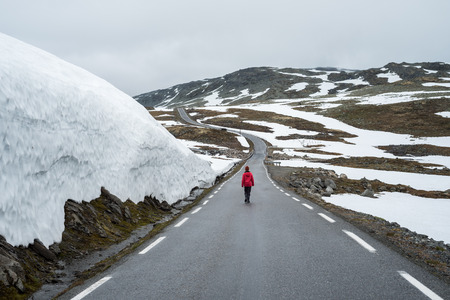 Bjorgavegen - Snowy road in Norway. Norwegian Scenic Route Aurlandsfjellet. A girl in a red jacket walks the mountain road