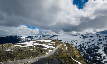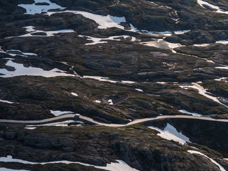 Dalsnibba - the highest fjord viewing point, accessible by car. Snowy mountain peaks and dangerous road. Geiranger, Norway.