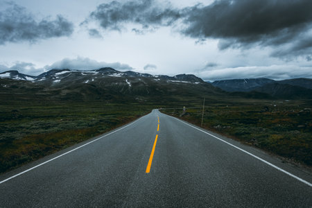 Empty road through the tundra of central Norway with cloudy and moody sky