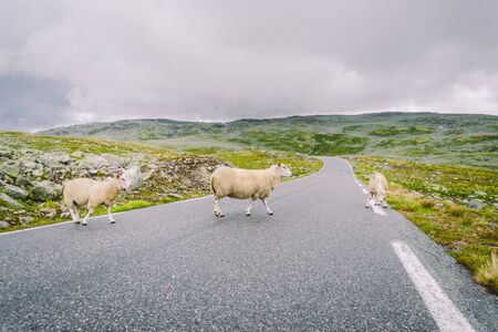 Sheep walking along road. Norway landscape. A lot of sheep on the road in Norway. Rree range sheep on a mountain road in Scandinavia. Sheep Farming. Mountain road with sheeps.
