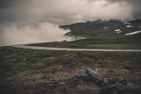 Rural Foggy and Cloudy Norwegian Raw Landscape. Scenic Alpine Road in South Western Part of Norway.