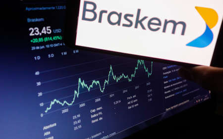 Braskem SA logo visible on smartphone screen, and website page showing stock chart of the stock in the background