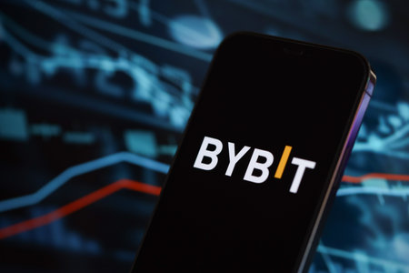KYIV, UKRAINE - MARCH 15, 2024 Bybit logo on iPhone display screen and crypto currency value charts. Cryptocurrency exchange portal