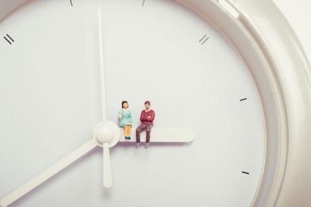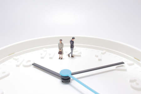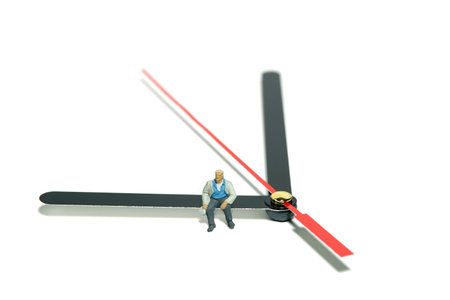 Miniature people toy figure photography. A men worker take a break rest sitting and waiting above clockwise. Isolated on white background. Image photo