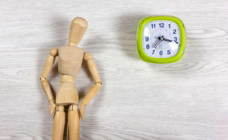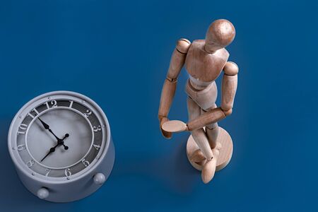 Wooden figure of a man on a blue background with a clock, the concept of object, time and man.