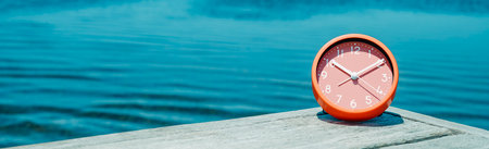 closeup of a pink clock on a wooden pier, next to the water, on a summer day, in a panoramic format to use as web banner or header