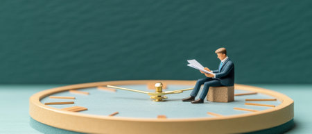 A miniature figure of a man reading a document on a clock face, symbolizing time management and productivity.
