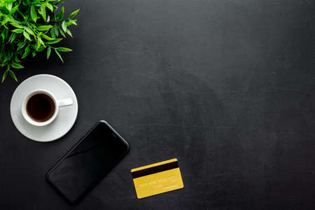 Mobile payment with smart phone and credit card. Online shopping concept. Top view
