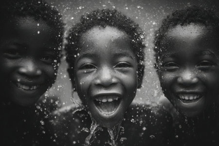 Three African American boys are joyfully playing in water, with droplets splashing around them, showcasing the essence of childhood joy and carefree moments
