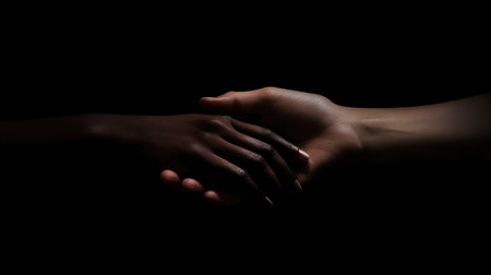 Two hands of different skin tones gently connect in deep shadows, expressing unity, support, and emotional human connection