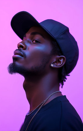 Stylish african american man in cap looking away on pink background