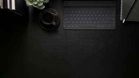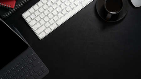 Top view of dark modern workplace with digital tablet, computer keyboard, coffee cup and copy space on black table