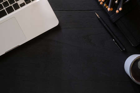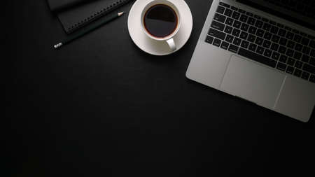 Overhead shot of dark modern workspace with laptop, stationery, coffee cup and copy space on black table