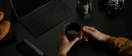 Cropped shot of female hands holding coffee cup while sitting at dark office desk with croissants and office supplies