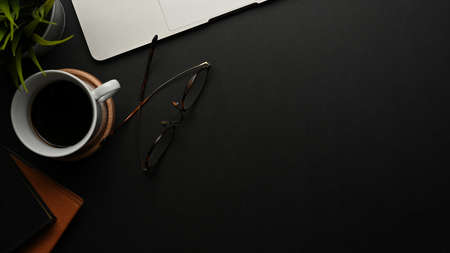 Top view of black table with copy space, eyeglasses, supplies and coffee cup in home office room
